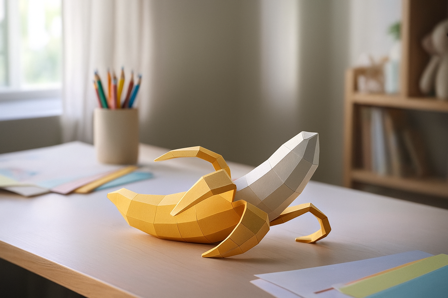 Build a paper Banana 3D model that adds color and witty style to modern interiors. A fun DIY craft and an original gift idea.