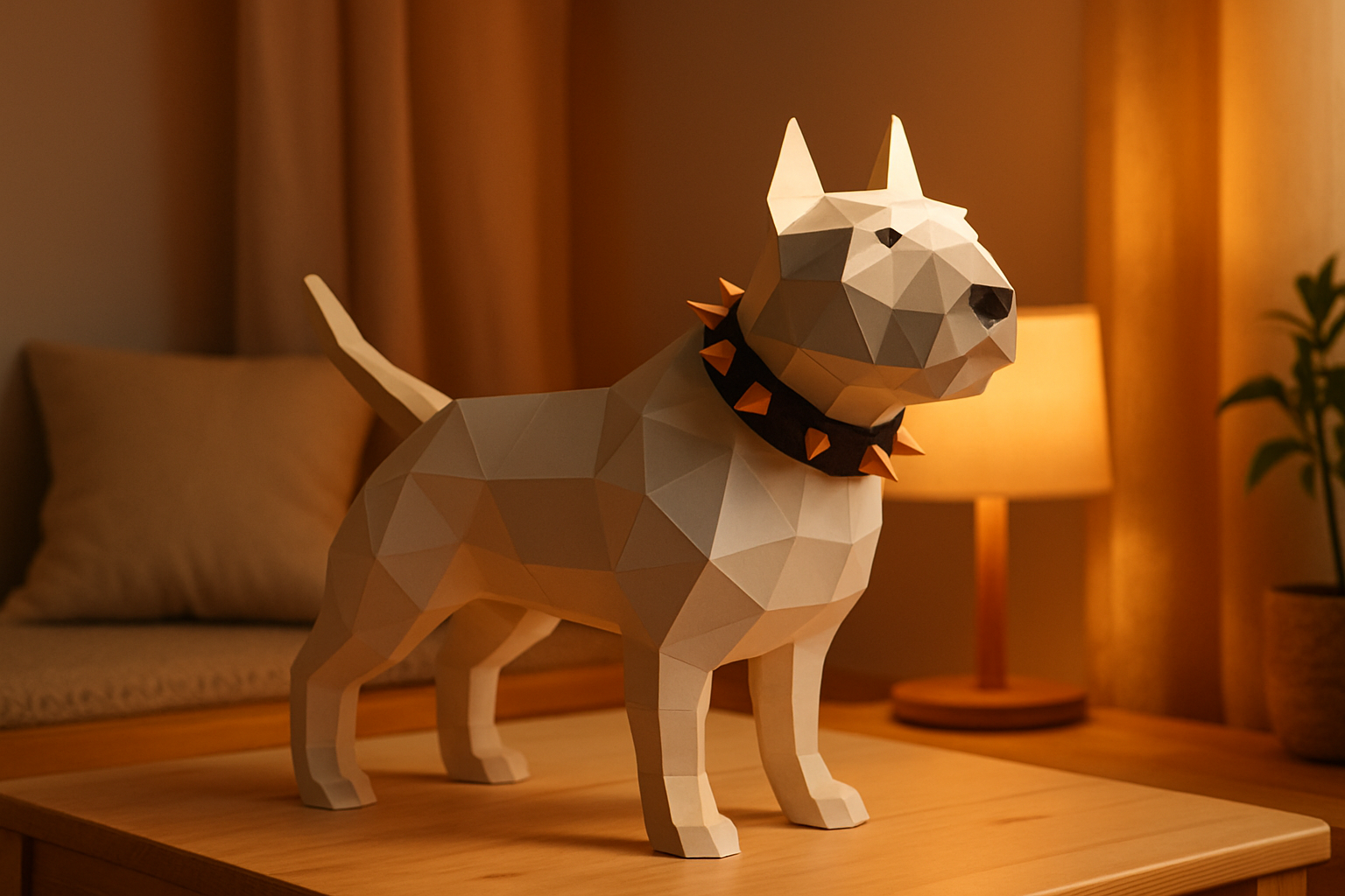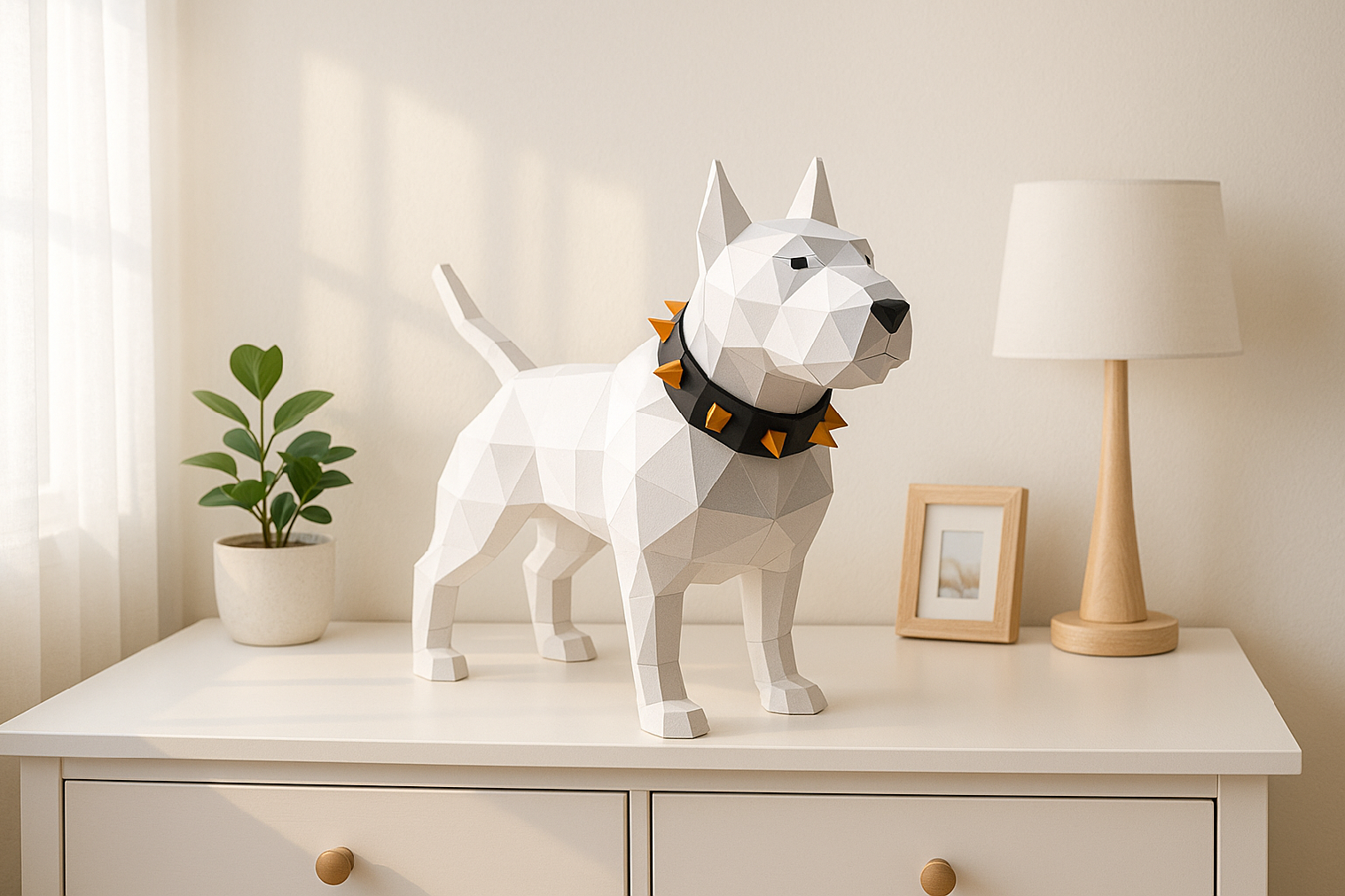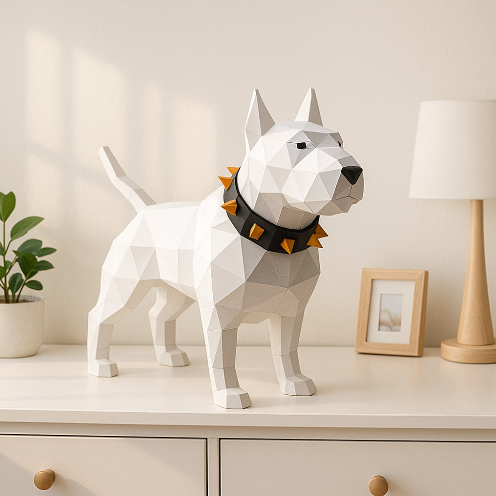 Create a Bullterrier paper 3D model with an iconic head shape and modern style. A satisfying DIY build and an original decor gift idea.
