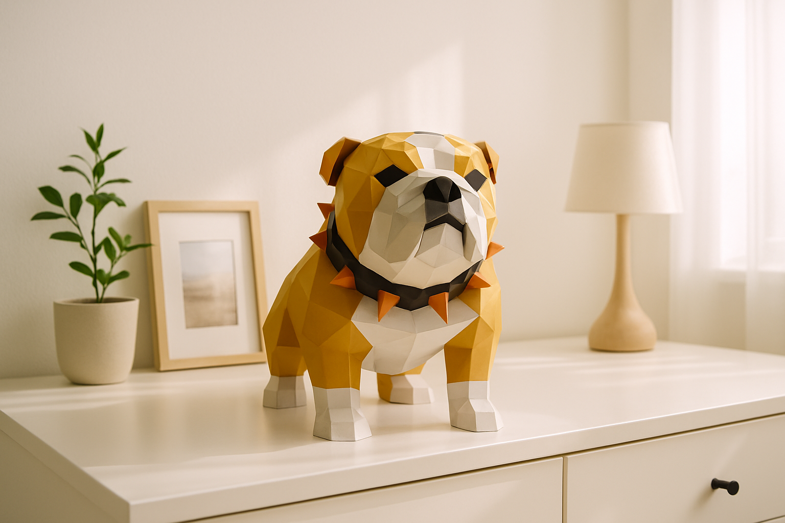 Build an English Bulldog paper 3D model with a strong silhouette and lovable face. A rewarding craft and a bold decor gift for dog fans.